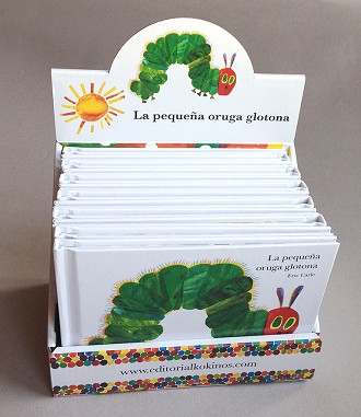 La oruga era muy pequeña, pero tenía un hambre enorme. Así que se pasó todo este cuento comiendo, atravesando página tras página. Hasta que finalmente se convirtió, como todas las orugas, en mariposa. Un libro agujereado de verdad por la muy glotona.