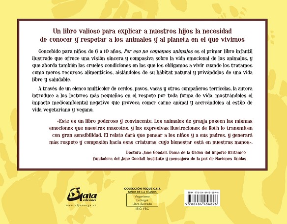 Un libro valioso para explicar a nuestros hijos la necesidad de conocer y respetar a los animales y al planeta en el que vivimos Concebido para niños de 6 a 10 años, Por eso no comemos animales es el primer libro infantil ilustrado que ofrece una visión sincera y compasiva sobre la vida emocional de los animales, y que aborda también las crueles condiciones en las que los obligamos a vivir cuando los tratamos como meros recursos alimenticios, aislándolos de su hábitat natural y privándolos de una vida libre y saludable. A través de un elenco multicolor de cerdos, pavos, vacas y otros compañeros terrícolas, la autora introduce a los lectores más pequeños en el respeto por toda forma de vida, mostrándoles el impacto medioambiental negativo que provoca comer carne animal y acercándoles al estilo de vida vegetariano y vegano.