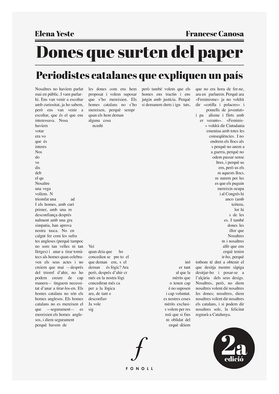 Un dia es comencen a veure. Per això aquest llibre: perquè es vegin. Un dia es comencen a veure les dones a Catalunya. Perquè aquesta antologia de peces periodístiques escrites per periodistes catalanes no és només això. No només mostra l’arribada de les dones al món del periodisme al nostre país entre finals del segle XIX i el primer terç del segle XX. Aquest recull d’articles, cròniques, reportatges, entrevistes és alguna cosa més: és l’explicació d’un nosaltres. De la nostra política, societat, cultura, economia... Dels hàbits, costums, esdeveniments, successos... De la família, els amics, el treball, l’oci, l’amor, la mort... De les alegries, les tragèdies, les esperances, les adversitats, les il•lusions... Perquè aquestes històries de la realitat corren paral•leles, emmirallades, imantades a l’evolució d’un periodisme, però també d’un país i la seva gent. De la llum a la foscor. De la Renaixença a la guerra. De l’inici al final. De tots. Per això les dones surten del paper i tenen el seu paper: les dones s’expliquen a elles però sobretot ens expliquen a tots nosaltres.