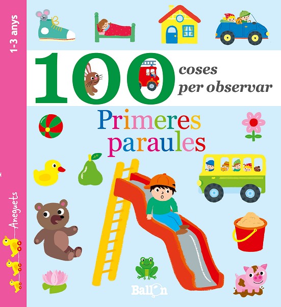 Dos agradables llibres per a nens d’1 a 3 anys. Cadascun presenta 100 graciosos dibuixos agrupats per temes, un a cada doble pàgina. Així, el nen aprèn vocabulari nou i descobreix el món que l’envolta. A més, cada doble pàgina proposa dues preguntes per estimular la capacitat d’observació del nen i treballar conceptes com els colors, les formes o aprendre a comptar.