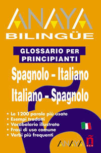 Anaya Bilingüe Spagnolo / Italiano es un manual práctico de fácil manejo para principiantes de cualquier edad con pocos o ningún conocimiento de español. La información está seleccionada siguiendo un criterio de utilidad práctica. Las entradas del Glosario van acompañadas de una pronunciación figurada (transcrita conforme a los sonidos propios del italiano), una mínima indicación gramatical y la traducción al italiano, seguida de un ejemplo traducido. Incluye las variantes léxicas hispanoamericanas más extendidas y se añaden como subentradas expresiones de uso común. Incluye un Glosario ilustrado (con más 400 palabras ilustradas) y un apartado con Situaciones cotidianas, con el léxico y las estructuras fundamentales para desenvolverse en ellas.