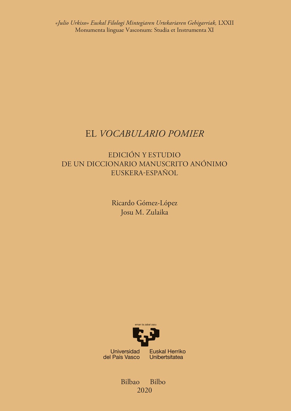 El Vocabulario Pomier llega a la Biblioteca Foral de Bizkaia en 1921, coincidiendo con un florecimiento de los estudios vascos centrado en la búsqueda y edición de textos antiguos. A partir del ?Diccionario vasco-español-francés? (1905-6) de Azkue, se produce entre los vascólogos un sentimiento de relajación en cuanto al rescate de antiguos vocabularios. Es necesario esperar a 1958 para que Mitxelena y Agud publiquen el ?Dictionarium linguae Cantabricae? de Landuchio, revulsivo que marca un cambio de tendencia en la lexicografía vasca e implica que los diccionarios antiguos vuelvan a suscitar interés. Hoy ya no están vigentes los criterios utilitaristas que podrían etiquetar de innecesario el estudio de este repertorio lexicográfico. Esta obra estudia la historia del manuscrito, aportando una descripción física del mismo y deteniéndose en la disyuntiva de determinar si es original o si se trata de una copia de otro escrito anterior.