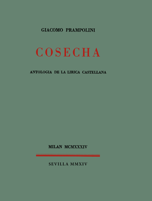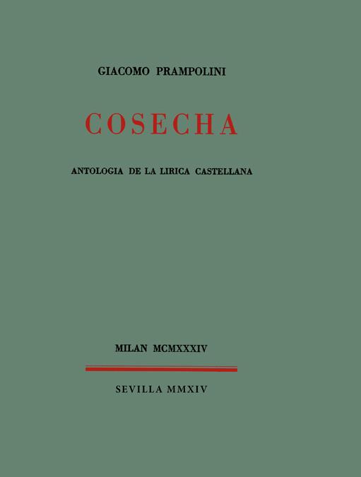 La «nueva» poesía española de los años 20 y 30, la de la llamada «generación del 27», no alcanzó grandes ventas pero sí un gran prestigio y una rápida internacionalización, que se consolidan hacia 1932, con la famosa antología de Gerardo Diego. Buena prueba de ello es esta Cosecha de Giacomo Prampolini, de la que se imprimieron, en Milán, en castellano y en fecha tan temprana como 1934, y con exquisita tipografía, 200 ejemplares numerados y fuera de comercio. En ella se incluyen poemas de A. Machado, J.?R. Jiménez, Moreno Villa, Rogelio Buendía, Salinas, Guillén, D. Alonso, Larrea, G. Diego, García Lorca, Alberti, Villalón, Prados, Aleixandre, Cernuda, Altolaguirre, José Mª Luelmo y R. Laffón.