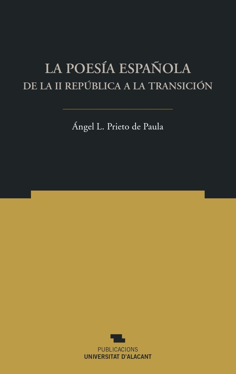 La poesía española de la II República a la Transición es un panorama histórico-crítico de la lírica española en castellano, del interior y del exilio, desde los prolegómenos de la Guerra Civil hasta la Transición, con irradiaciones hacia atrás (autores que iniciaron la publicación antes de los años treinta) y hacia delante (autores que la prosiguieron en el periodo democrático). El resultado desborda, pues, el coto que rotulamos «franquismo», y no solo por razón de cronología: también porque el término acaba contaminando los contenidos, y buena parte de esta poesía se hizo en contra del franquismo, e incluso fuera de España precisamente por haberse enfrentado a él.