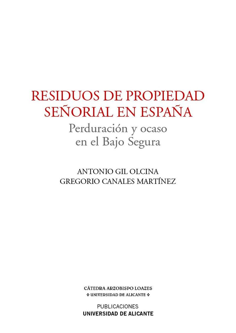 A comienzos del siglo pasado constituía un rasgo destacable, por insólito en tierras del antiguo reino de Valencia, la perduración de la propiedad de pasado señorial en un conjunto de pequeños municipios del Bajo Segura, antiguos estados nobiliarios. En 1904 los ingenieros del Servicio Agronómico Provincial de Alicante resaltaban que “la propiedad territorial está muy dividida en toda la provincia, si se exceptúa la huerta de Orihuela, donde existen algunas fincas que ocupan todo un término, como, por ejemplo… […] pero estas propiedades solo en parte son llevadas por sus dueños y lo demás está repartido entre un número mayor o menor de renteros”. Al finalizar el primer tercio del siglo XX, el Registro de la Propiedad Expropiable reflejaba una situación similar, al tiempo que evidenciaba la singularidad del hecho en el ámbito valenciano. Este contraste es el que incita al estudio comparado de las causas que han producido resultados tan diferentes y motiva este trabajo de geografía histórica.