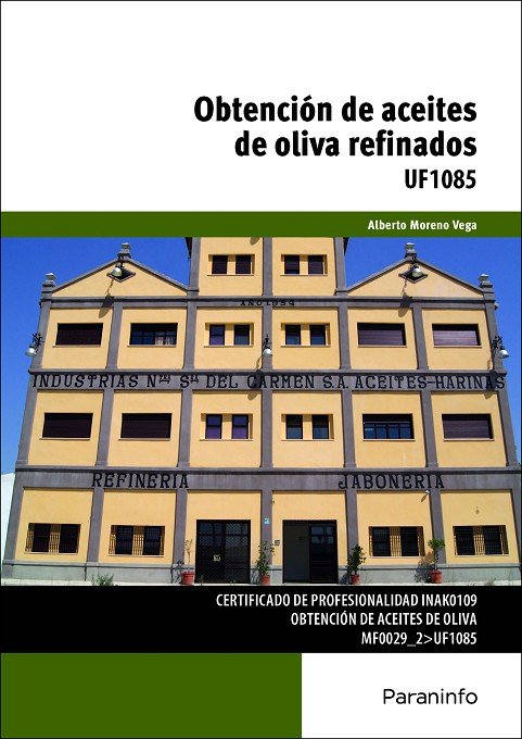 El presente manual se corresponde con la Unidad Formativa;UF1085, incluida en el Módulo Formativo MF0029_2: Operaciones de;proceso de extracción de aceites de oliva, que a su vez forma parte del;Certificado de Profesionalidad (INAK0109): Obtención de aceites de oliva;y cuyo contenido sigue a lo establecido por el Real Decreto 646/2011, de 9 de mayo, que regula los Certificados de;Profesionalidad en la Familia;Profesional Industrias Alimentarias.;A lo largo de sus;cuatro capítulos, este libro plantea, de un modo comprensible, los aspectos más;importantes a considerar en la;obtención de aceites de oliva refinados. La refinación elimina los componentes;de los aceites de oliva lampantes que deterioran el sabor, la estabilidad, el;aspecto físico y su valor nutritivo. El refinado produce un aceite de oliva;comestible con las características deseadas por los consumidores, como sabor y;olor suaves, aspecto limpio, color claro, estabilidad frente a la oxidación e;idoneidad para freír alimentos.;Alberto Moreno;Vega está titulado en distintas ramas de la ingeniería, es Técnico;Superior y especialista Universitario en PRL. Ha escrito numerosos artículos y;libros técnico-didácticos dedicados a ingeniería rural, cultivos agrícolas e;industrias agroalimentarias. Desde hace más de 10 años desarrolla su actividad;profesional como empleado público en la Consejería de Agricultura, Pesca y;Desarrollo Rural, Junta de Andalucía.