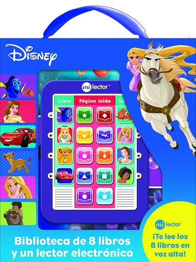 Biblioteca de 8 libros Disney tapa dura y un lector electrónico. 'Mi Lector' te lee los 8 libros en voz alta. Incluye los libros con la aventuras de los personajes Disney y sus mejores amigos 'El Rey León. Un leoncito valiente' 'Buscando a Dory', 'Enredados. Corazones alegres', 'Alicia en el País de las Maravillas', 'Cars. Una factura sobre ruedas', 'La Bella y la Bestia. La sorpresa de Bella', 'El Libro de la Selva. Inteligente y fuerte' y 'Nemo. Un viaje Increible'.