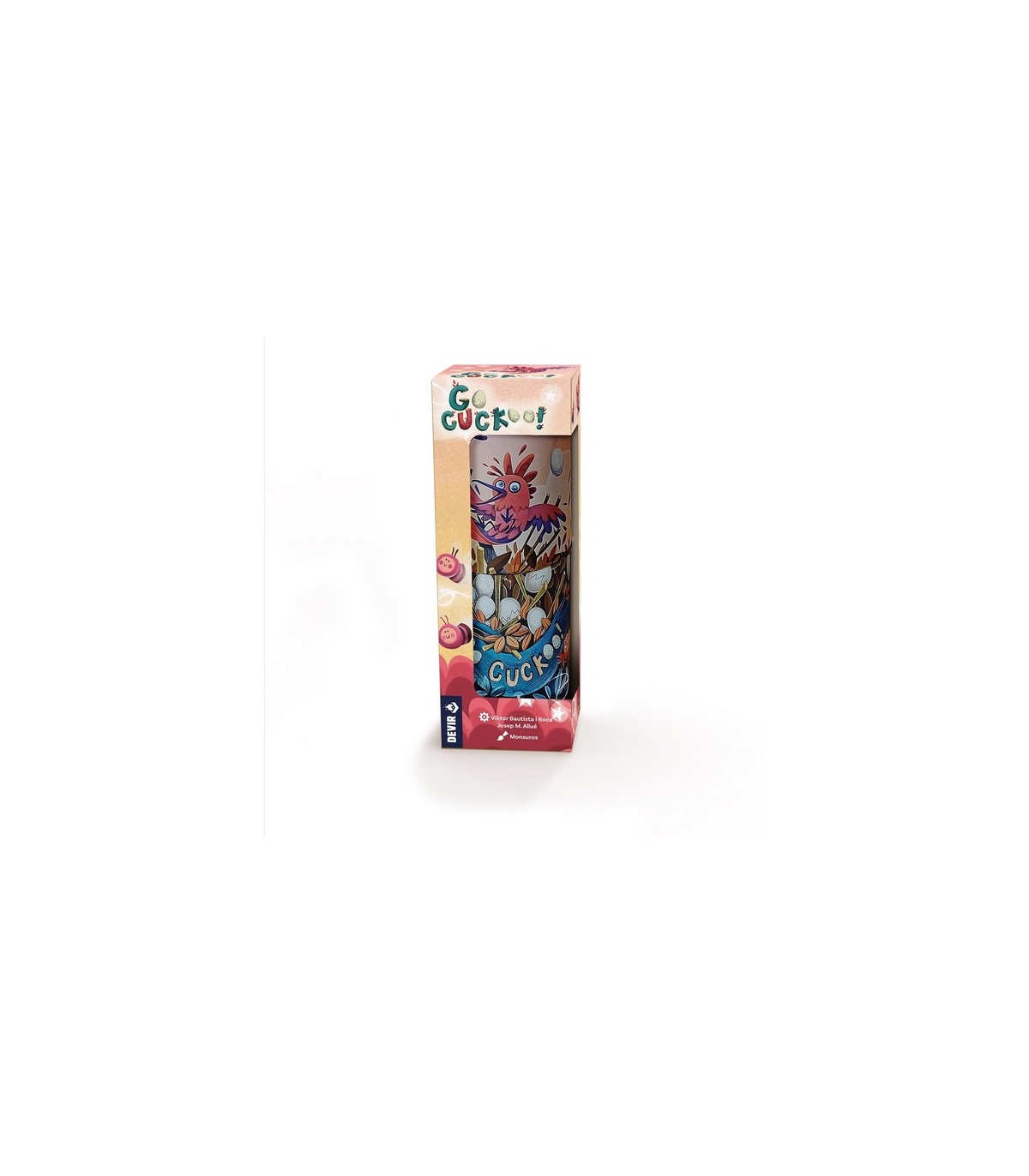 ¡Ayuda al cuco Kuki a construir su nido! En este divertido juego de habilidad, deberéis colocar palos como si fueran ramas para que sostengan los huevos. Pero hacedlo con mucho cuidado, pues cualquier movimiento en falso puede hacer que la estructura se caiga. Ganador del prestigioso As d’Or al mejor juego infantil, Go Cuckoo! es un título ideal para disfrutar en familia.