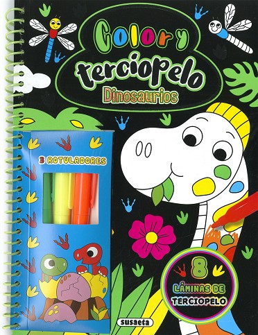 Colorea con los rotuladores fosforitos las láminas de dinosaurios de este libro, entre las cuales encontrarás 8 láminas supersuaves decoradas con terciopelo.