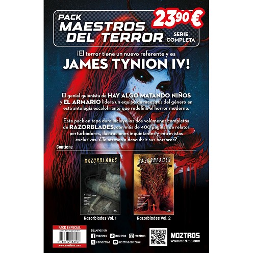 ¡EL TERROR TIENE UN NUEVO REFERENTE Y ES JAMES TYNION IV! El genial guionista de HAY ALGO MATANDO NIÑOS y EL ARMARIO lidera un equipo de maestros del género en esta antología escalofriante que redefine el horror moderno. Este pack en tapa dura incluye los dos volúmenes completos de RAZORBLA...