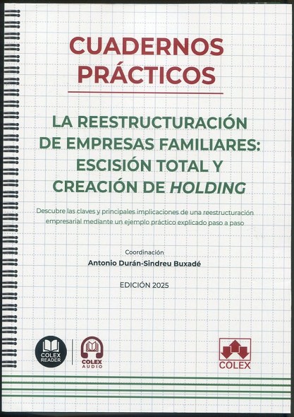 Guía práctica y metódica para la reestructuración de empresas familiares, centrada en un caso real. Analiza paso a paso la escisión total y creación de un holding, destacando las implicaciones fiscales y ofreciendo esquemas claros y referencias a doctrina y jurisprudencia
