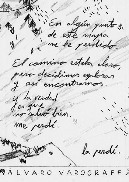 Me perdí trata de materializar en formato libro ese sentimiento de desorientación y abandono que se siente cuando te sientes perdido, sin rumbo, como perderse en la noche en un bosque. Este libro de artista es completamente negro, desde la tinta hasta el papel, el cual está cubierto por un mapa de donde puede haber sucedido esa pérdida, el único elemento blanco que complementa el sentido material del trabajo.