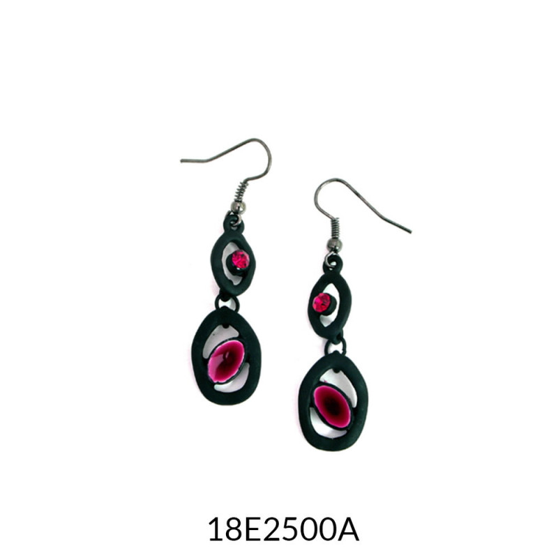 Incrustaciones de cristal. Metal esmaltado libre de cadmio, plomo y níquel. Antialérgico. 5 cmts de largo. Cierre de gancho abierto.