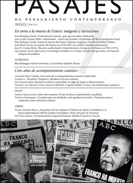 El número 72 de la revista ?Pasajes? incluye un dosier titulado ?En torno a la muerte de Franco: imágenes y narraciones?, que toma como punto de partida un acontecimiento histórico y simbólico a la vez (la muerte de Francisco Franco) para proponer un recorrido interdisciplinar que examina aquel momento desde la historia, la literatura y el análisis de distintos medios audiovisuales, escritos por Rita Rodríguez Varela, Juan Carlos Colomer Rubio, Jordi Revert Gomis, Juan R. Cerdán Rubio y Juan Ignacio Torres Montesinos, así como una entrevista a la novelista Isabelle Alonso. El otro dosier, titulado ?Cien años de acompañamiento cuántico?, toma como referencia la efeméride del centenario de la formulación de la mecánica matricial de Werner Heisenberg y la mecánica ondulatoria de Erwin Schrödinger en 1925 para articular una mirada transversal que conecte historia, teoría, experimentación y aplicaciones, con contribuciones de Armando Pérez Cañellas, Carmen G. Almudéver, José Navarro-Salas, Germán J. de Valcárcel, Carlos Navarrete-Benlloch y Eugenio Roldán. Además, este número también incluye artículos de Antonio Moya Latorre y Verónica Cannarozzo.