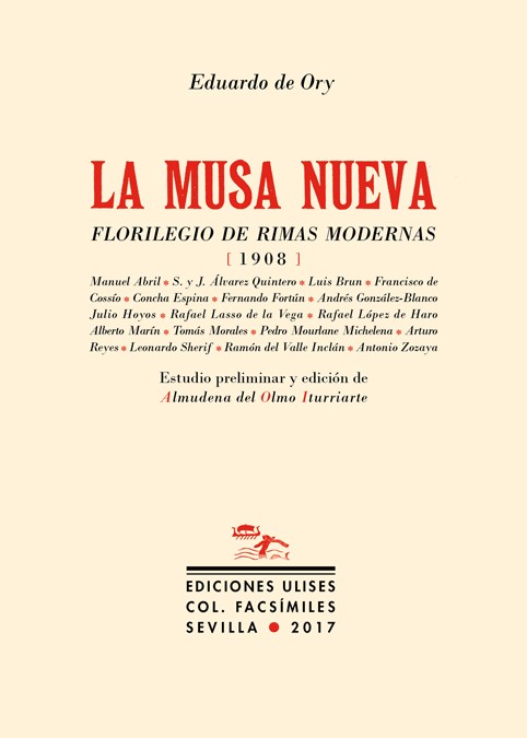 Con un sentido histórico indiscutible La musa nueva (1908) es la segunda antología del modernismo poético español. Complemento de La corte de los poetas (1906) de Emilio Carrere, ofrece una selección de noventa y cinco nombres. Es el eslabón intermedio para la conformación del canon modernista, desembocando en la Antología de la poesía española e hispanoamericana (1934), de Federico de Onís. Editadas todas en facsímil por Renacimiento. Como Florilegio de rimas modernas muestra el conglomerado estético tan vario como contradictorio que define en su modernidad la poesía española finisecular. El gaditano Eduardo de Ory, poeta en la órbita del modernismo, prosista, antólogo de poesía española y de parnasos hispanoamericanos y creador de revistas clave como Azul, fue también un auténtico dinamizador cultural. Su estancia en Zaragoza entre 1906 y 1908 y su labor literaria en distintos periódicos y revistas fueron determinantes para cuajar las relaciones personales y poéticas que le permitieron compilar La musa nueva. El estudio preliminar es de Almudena del Olmo Iturriarte (Universidad de las Islas Baleares). Ha trabajado sobre temas diversos de la literatura española contemporánea. Entre otros títulos ha publicado la Antología de la poesía modernista española (2008) y Las poéticas sucesivas de Juan Ramón Jiménez (Renacimiento, 2009).