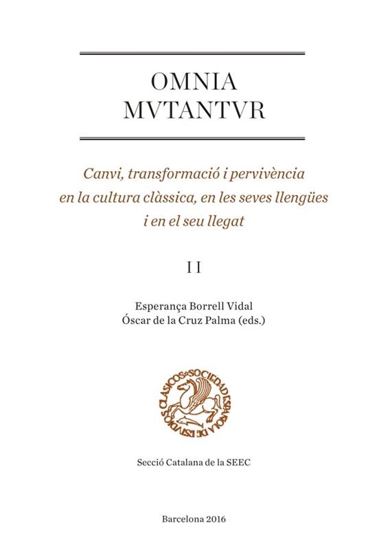 Els dos volums d?Omnia mutantur apleguen algunes de les contribucions que, focalitzades en la cultura, la literatura, la llengua i la civilització de la Grècia i la Roma antigues, així com en la seva pervivència, es presentaren en el decurs d?unes jornades celebrades a la Universitat de Barcelona el juliol de 2013. El fil conductor dels articles que componen els llibres és el concepte de canvi i la capacitat d?adaptació dels antics a noves circumstàncies i nous contextos socials, culturals, intel·lectuals i lingüístics, fet que permet reconèixer també la vigència de l?Antiguitat grega i romana. Aquest segon volum ofereix nombroses actualitzacions de temes relacionats amb el món llatí, sovint revisionistes sobre teories existents, sovint innovadores. Omnia mutantur vol ser un instrument útil per als filòlegs i estudiosos del món antic, i alhora contribuir a la difusió i continuïtat de la tasca que es realitza en aquest camp del coneixement.