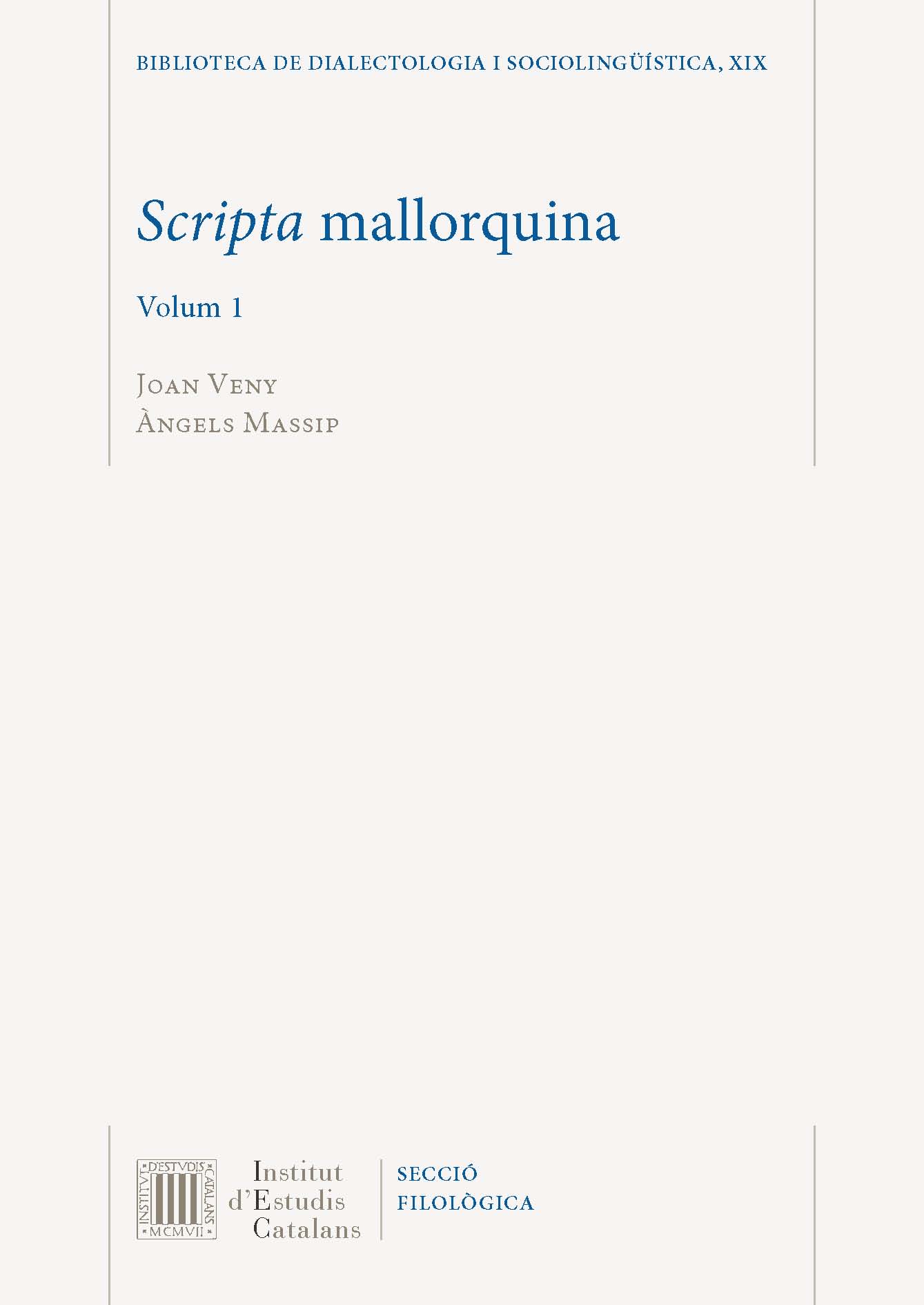 La ‘Scripta’ mallorquina, a cura de Joan Veny i Àngels Massip, és una selecció de textos que van del segle xiv al segle xxi i que ofereixen una àmplia perspectiva de la llengua escrita a Mallorca —i a través de l’escrit, de l’oralitat de cada època. Presenta temàtiques i gèneres tan diversos com poden ser les rondalles, els inventaris, els testaments, els sermons, la lexicografia o el teatre popular. El valor d’aquesta obra resideix precisament en la gran quantitat de textos recollits, un total de tres-cents quaranta-set, que van acompanyats d’una anàlisi exhaustiva i precisa de les característiques gràfiques (a través de les quals es reflecteixen les fonètiques), morfològiques, sintàctiques i lèxiques més remarcables del text i que en defineixen la llengua com a varietat mallorquina. És una obra fonamental per al coneixement de la cronologia dels canvis. En el segon volum hi figura un glossari amb totes les paraules que surten comentades en les anàlisis lingüístiques i, al costat, la referència a l’any i al gènere del text on apareixen. Aquesta obra, que forma part del projecte de recerca Diatopia i canvi lingüístic. ‘Scripta’ i variació dialectal (FFI 2012-36000), complementa la ‘Scripta’ eivissenca i la ‘Scripta’ menorquina, publicades per l’Institut d’Estudis Catalans el 2009 i el 2011 respectivament. Totes tres obres pertanyen a la col·lecció «Biblioteca de Dialectologia i Sociolingüística».