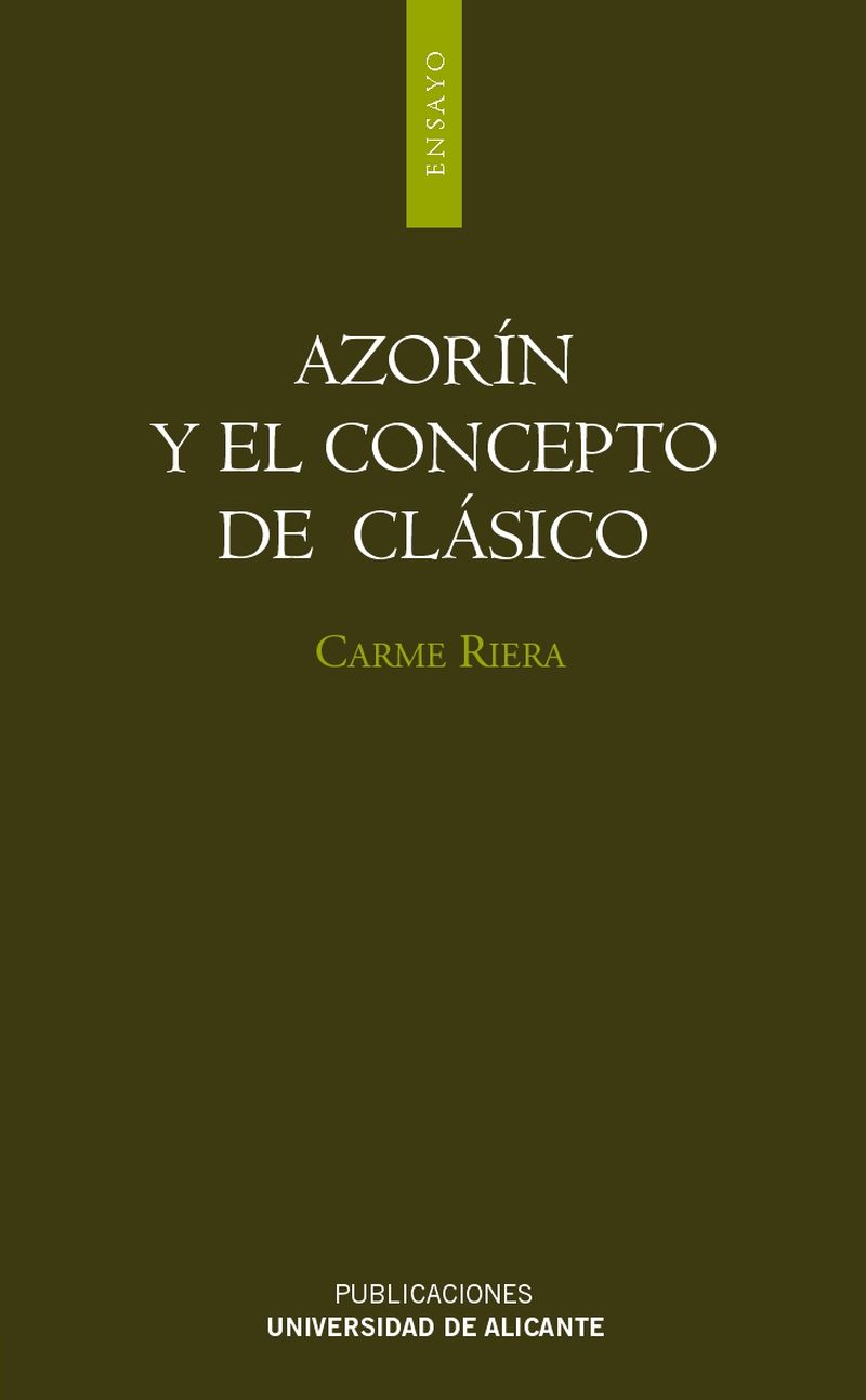 Azorín y el concepto de clásico contribuye a estudiar una de las facetas más interesantes del autor alicantino: su relación con los clásicos nacionales. Tras una contextualización del debate sobre los clásicos en las letras españolas de los inicios del siglo XX, Carme Riera traza un itinerario por los textos azorinianos para observar que Martínez Ruiz pasa por tres etapas: aceptación, rechazo y posterior recuperación de los clásicos nacionales de los que se convertirá a partir de 1905 en su principal valedor. El ensayo de Carme Riera presta especial atención a la elaboración del concepto de “ clásico” por parte de Azorín, en deuda con Unamuno, según la autora, y se detiene en los textos de Azorín que mejor lo analizan. Lejos de estar obsoleto el método azoriniano, basado en la sensibilidad, nos incita a que los lectores sigamos reescribiendo las obras de los clásicos.