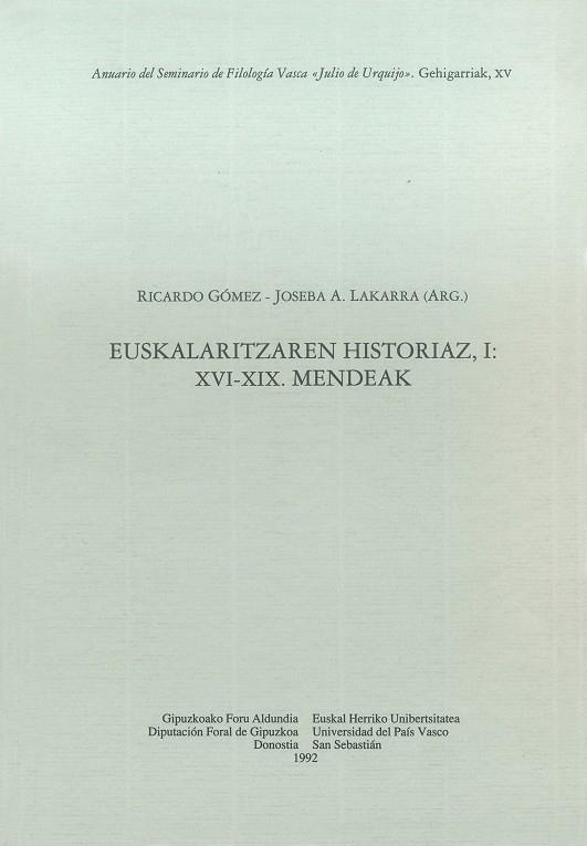 Índice / Aurkibidea: Historia de las ideas acerca de los límites geográficos del vasco antiguo. Euskaldunek euskalkienganako izan dituzten jarrerez. Euskal fonologiazko berriak 1900 arte. Ohar batzuk euskal deklinabidearen historiografiarako. Les travaux de grammaire basque avant Larramendi (1729). André de Poza y el euskera. La gnosis renacentista del euskera. Garibai hizkuntzalari. Oihenart Silvain Pouvreauren hiztegia. Euskara XVI-XVII mendeetako zenbait idazle atzerritarrengan. Pierre d'Urreren hiztegia. Euskara eta euskararekiko ikerlanak (1700-1800). Larramendiren gramatika eta gramatikagintzaren historia. Larramendirekin aurreko hiztegigintzarten historiaz: aztergai eta gogoeta. Larramendiren eraginaz eta. Las ideas lingüísticas del siglo XVIII en Lorenzo Hervas. Las fuentes ocultas del romanticismo vasco. Astarloaren hizkuntzalaritzaz. Guillaume de Humboldt et la langue basque. Esku-liburua-ren grafi aldaketak (1802-1821). Bonaparte Printzearen inguruko hizkuntz eztabaidak. Van Eysen gramatika-lanak. Julen Vinson, el euskera y una polémica del XIX. Campiónen Gramática eta beste. Euskalaritzaren eta hizkuntzalaritzaren historiarako bibliografia.
