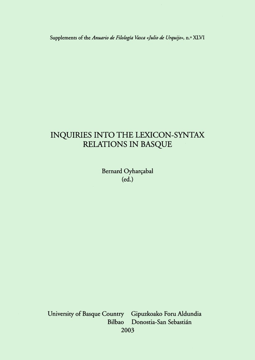 Morphosyntactic disambiguation and shallow parsing in computational processing in Basque. The transitivity of borrowed verbs in Basque: an outline. Patrixa: a unification-based parser for Basque and its application to the automatic analysis of verbs. Learning argument/adjunct distinction for Basque. Analyzing verbal subcategorization aimed at its computation application. Automatic extraction of verb paterns from ?hauta-lanerako euskal hiztegia?. The case of an enlightening, provoking an admirable Basque derivational siffux with implications for the theory of argument structure. Verb-deriving processes in Basque. Lexical causatives and causative alternation in Basque. Causation and semantic control; diagnosis of incorrect use in minorized languages.