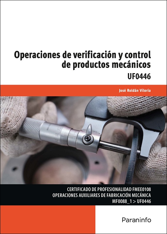 El presente libro desarrolla los contenidos de la Unidad Formativa (UF0446) Operaciones de verificación y control de productos mecánicos, incluida en el módulo formativo Operaciones de montaje (MF0088_1), correspondiente al Certificado de Profesionalidad FMEE0108 Operaciones auxiliares de fabricación mecánica, regulado por el Real Decreto 1216/2009, de 17 de julio.;El contenido tecnológico de esta obra trata de materias básicas para los profesionales mecánicos, como son la metrología mecánica y la medición y el control de piezas y conjuntos. También se estudia la detección de anomalías en las máquinas, fruto de la observación y la medida sobre el funcionamiento de los diferentes elementos y componentes.;Son muchos los instrumentos que se van a estudiar y, aunque no son todos, sí que se tratan los más representativos. Lo que se pretende es que el alumnado conozca lo más a fondo posible la importancia de la medición en el trabajo mecánico, su lectura, la forma de medir y la conservación de los instrumentos, haciendo hincapié sobre las magnitudes, sus unidades y sus divisiones.;El conocimiento de la tecnología de la medición y sus instrumentos le van a permitir realizar su actividad en las mejores condiciones y fabricar productos con los niveles de calidad exigidos.;El operario mecánico conocerá también el procedimiento para rellenar hojas de control y realizar las anotaciones que dicha información requiera.;El contenido de esta obra está acompañado de gran cantidad de imágenes y tablas con gran nivel de detalle, completando cada capítulo con actividades finales de repaso, para comprobar lo que se ha aprendido.;José Roldán Viloria ha tenido una intensa vida profesional en el campo de la industria, desarrollando y materializando proyectos, que ha compaginado con la enseñanza en la Formación Profesional y con la elaboración de más de 60 libros técnicos en los que se recogen de forma clara y precisa las diferentes tecnologías desarrolladas y su aplicación práctica (mecánica, neumática, hidráulica, electricidad, fluidos y energías renovables). Algunos de estos títulos han sido traducidos.
