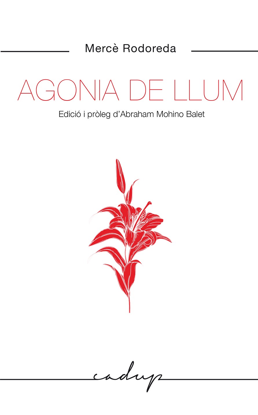 La poesia de Mercè Rodoreda és una part essencial de la seva producció literària. Fruit de l’exili, aquesta part es va publicar aïlladament i puntual en revistes i no es va conèixer en tota la seva dimensió fins a la publicació d’Agonia de llum (2002), signada per Abraham Mohino Balet acompanyada de reproduccions de l’obra pictòrica de l’autora i de la correspondència amb Josep Carner a propòsit de la creació dels seus versos. Passats vint anys, i exhaurida aquella edició, Godall Edicions la torna a posar en circulació en la col·lecció «Cadup», sense les reproduccions pictòriques ni la correspondència amb Carner, però acompanyada de dos pròlegs d’Abraham Mohino Balet: el mateix que va signar en l’edició de 2002 —revisat— i un altre d’actual on justifica la pertinença i oportunitat de tornar a publicar i per tant reivindicar l’obra poètica de Rodoreda. Per a Godall Edicions, és un orgull incorporar al catàleg aquesta Agonia de llum, l’única imatge integral de la Rodoreda poeta.