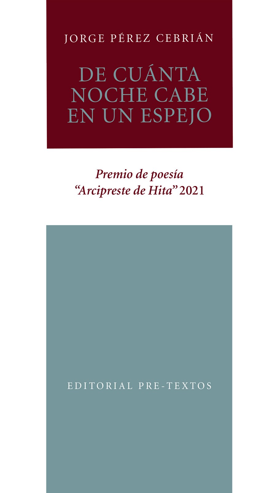 Jorge Pérez Cebrián nació en Requena (Valencia) en 1996. Actualmente cursa el grado de Filosofía en la UNED, disciplina que impregna la temática de sus poemas. Su primer libro publicado fue La voz sobre las aguas (Valparaíso, 2019). Más adelante publica La lumbre del barquero (Olé-Libros, 2021), obra nominada al Premio de la Crítica de la Comunidad Valenciana en 2021. Además, en este tiempo, ha coordinado los eventos poéticos «Las noches de Eleusis» en Madrid. Participa en antologías como Para decir amor sencillamente (Diputación Provincial de Granada, 2021) y publica poemas en revistas como El coloquio de los perros, Estación Poesía, 21veintiúnversos, etcétera. En este su tercer libro, De cuánta noche cabe en un espejo, el autor trata de redescubrir los temas esenciales del ser humano, que han venido atravesando una tradición a la que se rinde reverencia. Poemas que desde la fragilidad buscan el destello que une lo humano con lo eterno, con el terror sagrado que ese encuentro implica.