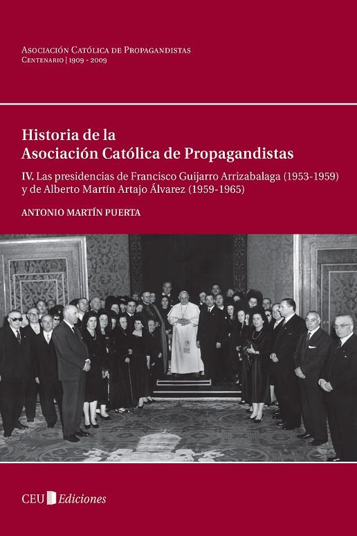 La redacción de la Historia de la Asociación Católica de Propagandistas, hito en el año de celebración de su Centenario, concluye -de momento- con este cuarto volumen, en el que Antonio Martín Puerta aborda, con pluma incisiva y un abundante respaldo documental, las presidencias sucesivas de Francisco Guijarro Arrizabalaga (1953-1959) y Alberto Martín Artajo (1959-1965). La historia de la Asociación en este intervalo temporal se sitúa en uno de los períodos clave de la evolución de España y de la Iglesia. De hecho, resulta imposible la correcta interpretación de los acontecimientos posteriores si no se captan con nitidez las corrientes esenciales de una época que incluye un conjunto de puntos de inflexión fundamentales, y no sólo religiosos -entre 1962 y 1965 se desarrollará el Concilio Vaticano II- sino igualmente políticos, económicos y sociales. Sin olvidar cambios en el panorama internacional como la puesta en marcha del proceso de unificación de Europa, que tanto modificará la perspectiva histórica de quienes protagonizaron la época.