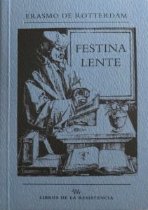Festina lente (Apresúrate despacio) es un proverbio latino comentado por Erasmo de Rotterdam pero también es, sobre todo, un elogio a la figura de Aldo Manuzio como impresor, quien había co- menzado a utilizar dicho proverbio, junto con el grabado de la figura de un delfín en- roscándose en un ancla, como marca de la calidad y de la autentici- dad de sus libros. • • •
