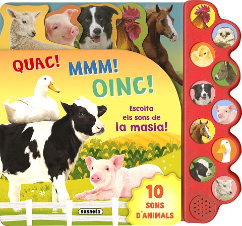 Deu sons d'animals que viuen en una masia, i que et faran creure que ets allà amb ells: el porc, la vaca, el gall... Amb pàgines de cartró encunyades perquè les passis amb més facilitat. Aquest llibre de gran format és ideal per a veure i escoltar els teus animals preferits!
