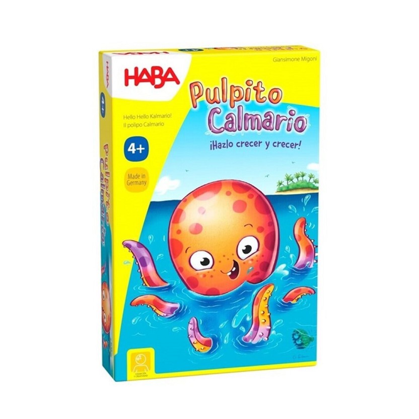 MEDIDAS: 15,3 X 23,3 X 4,3 EDAD: +4 años NÚM. JUG.: 2-4 jug. DURACIÓN: 10 min. CONTENIDO: 1 cuerpo de Calmario (hexágono), 1 cabeza de Calmario (bola de madera), y 30 fichas de tentáculo (triángulos) MATERIAL: Madera de haya y cartón OTROS DETALLES: Reglas sencillas para jugar de inmediato. La cabeza del pulpo es de madera de alta calidad COMPETENCIAS: Reconocimiento de colores y formas, Memoria, Visopercepción PAÍS ORIGEN: Alemania PALABRAS CLAVE: juego de mesa, juego de mesa infantil, juego de mesa HABA, HABA ADVERTENCIAS: Atención. No apto para niños/as menores de 3 años. Piezas pequeñas. Peligro de asfixia.