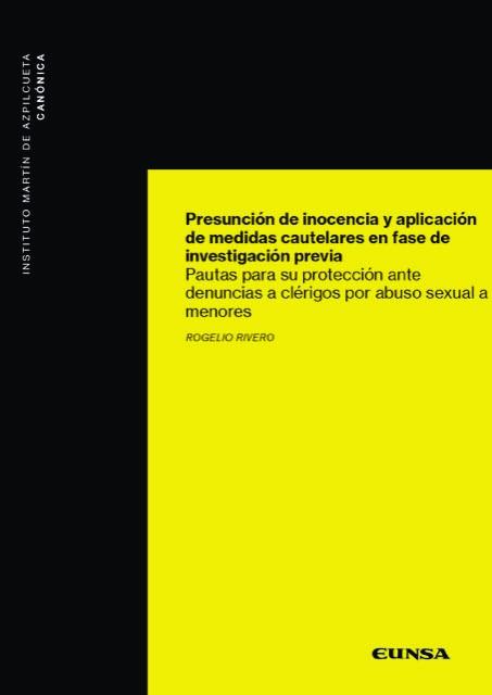 La presunción de inocencia es un principio jurídico universal del derecho, que establece que toda persona acusada de un delito no puede ni debe ser considerada, declarada ni castigada como culpable hasta que se dicte una sentencia definitiva de condena. Esta publicación se centra en la protección del derecho a la presunción de inocencia de los clérigos denunciados por delitos contra el sexto mandamiento con menores, enfatizando la necesidad de resguardar este derecho frente a la imposición de medidas cautelares durante la fase de investigación previa. Para ello, se profundiza, desde una perspectiva histórica, doctrinal y jurisprudencial, en las implicaciones legales del principio de presunción de inocencia, tanto en el ordenamiento jurídico secular como e ...