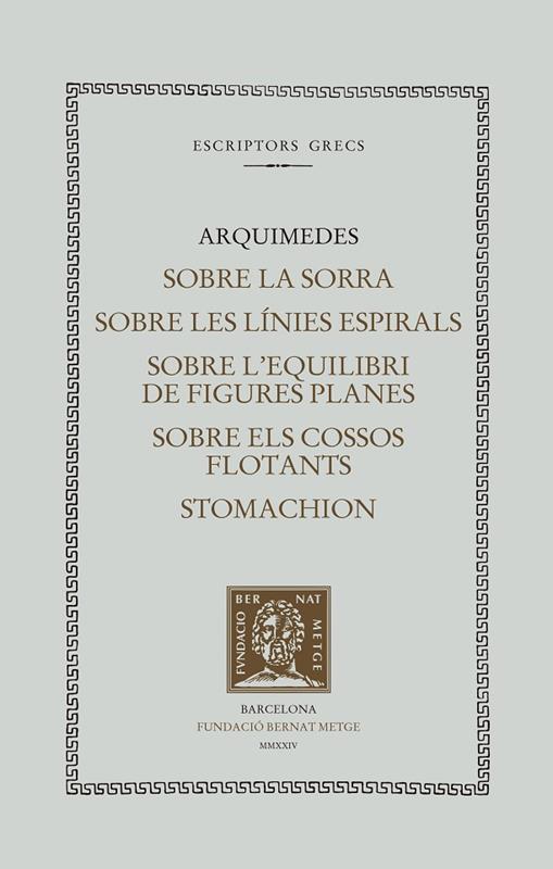 Aquest volum aplega cinc tractats de qui és comunament es considera el més gran matemàtic de l’Antiguitat: Arquimedes (segle III aC). El llibre de la sorra (o Arenari), potser la seva obra més creativa, tracta de la diferenciació entre el finit i l’infinit. A Sobre les línies espirals, Arquimedes empra l’espiral arquimediana per aconseguir la quadratura del cercle i la trisecció d’un angle. En els dos llibres que formen Sobre l’equilibri de les figures planes, s’explora la qüestió de determinar el centre de gravetat de diferents figures geomètriques. Sobre els cossos flotants és el primer tractat d’hidrostàtica de tots els temps, una ciència que Arquimedes va fundar amb aquesta obra. Finalment, a l’Stomachion explora les possibilitats d’assemblatge de catorze peces diferents en un quadrat.