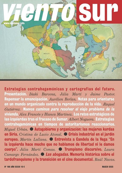 El Plural 2, “Trumpismo discursivo” donde Laura Camargo Fernández analiza las estrategias comunicativas de las nuevas derechas. La sección de El desorden global, se abre con un artículo de Cristina de Lucio Atonal, “Autogobierno y organización: las mujeres kurdas en Siria” que a partir de su autoorganización autónoma han desempeñado un papel clave en la transformación sociopolítica de Rojava. Le sigue la “Crisis industrial en el jardín europeo”, donde Martín Lallana hace una radiografía de La crisis industrial en Europa. A continuación, encontramos una entrevista a la activista feminista Candela de la Vega, que analiza la victoria electoral de Javier Milei en Argentina y el contexto político y social que permitió su ascenso. Finalmente, en Futuro anterior, encontramos “Las abogadas” una aproximación crítica sobre el tardofranquismo y la transición a través de un recorrido por el cine documental de la época hasta nuestros días de la mano de Raúl Navas.