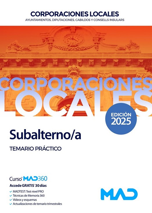 Temario Práctico para la preparación de las pruebas selectivas de acceso al Cuerpo de Subalternos de las distintas Corporaciones Locales. Para que la preparación sea competitiva y eficaz, esta obra se ha centrado en aspectos prácticos de las funciones propias de cualquier Subalterno/a de un Ayuntamiento, Diputación u otra Entidad Local. Se recogen aspectos tan importantes como la información y atención al público; la apertura y cierre de edificios y locales; la correspondencia y los diferentes tipos de envío; carga, descarga y transporte de materiales; trabajos de oficina; revisión y reposición de materiales; preparación de reuniones; plan de emergencias y primeros auxilios, etc…